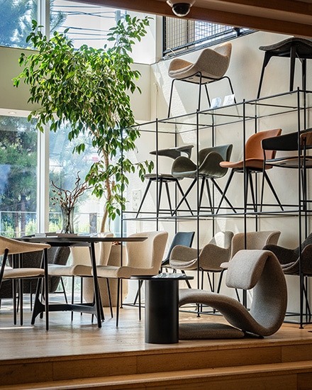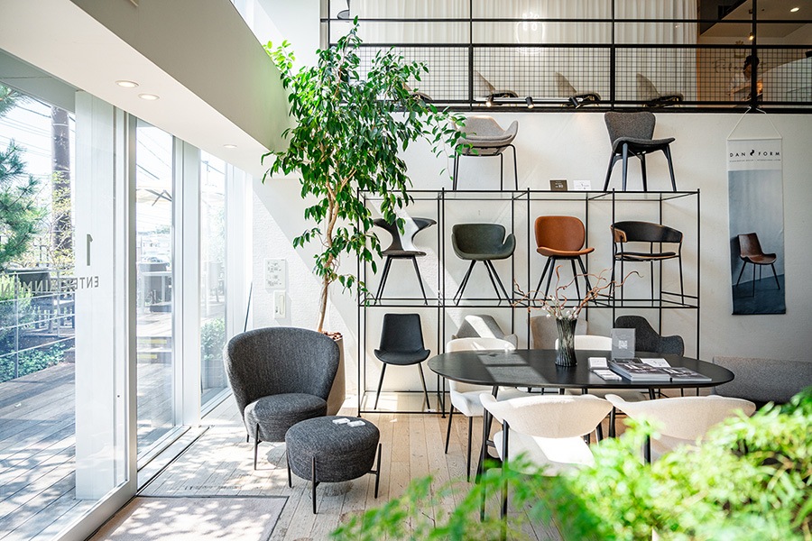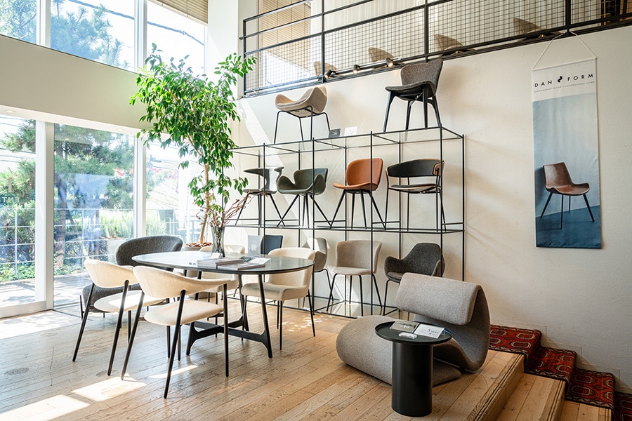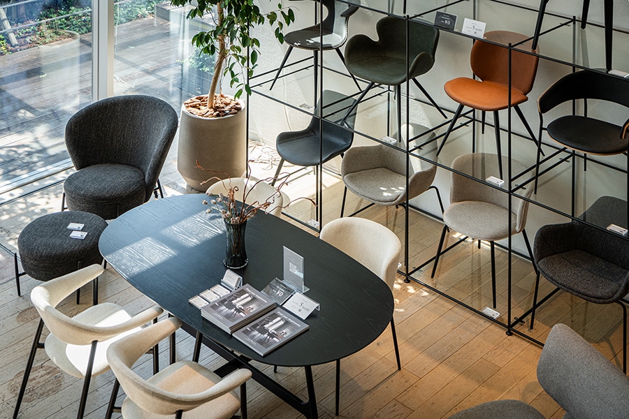 光が差し込む心地よい空間に、約30種類のダイニングチェアやテーブル、